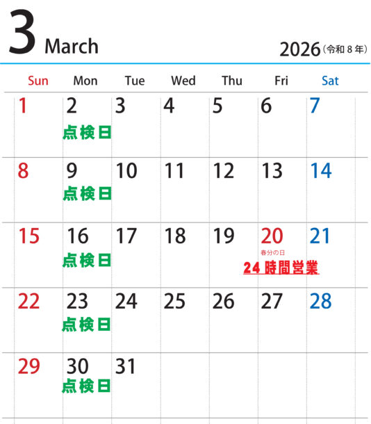 ※月曜6時~11時は機械/設備点検のためクローズです