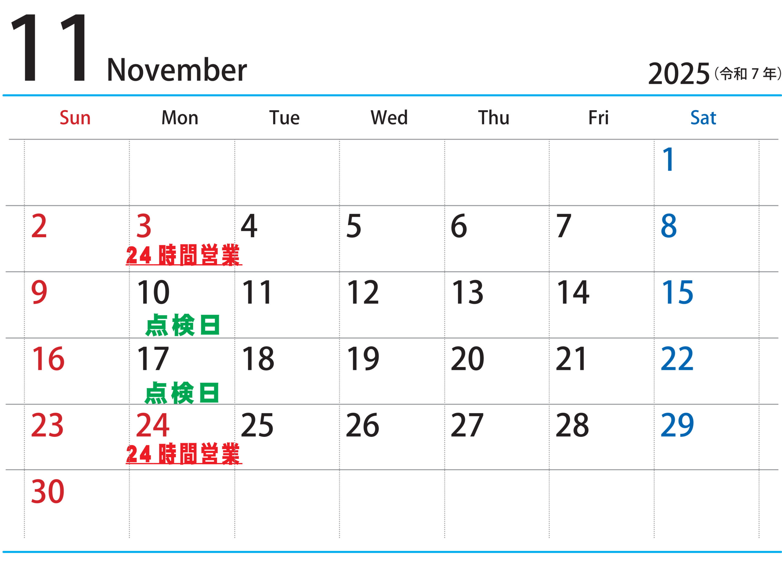 11月は、3日(月曜日)、24日(月曜日)祝日は24時間営業です。10、17の月曜日は、設備点検のため6時から11時はメンテナンス休業です。 お間違えのないよう、よろしくお願いいたします。