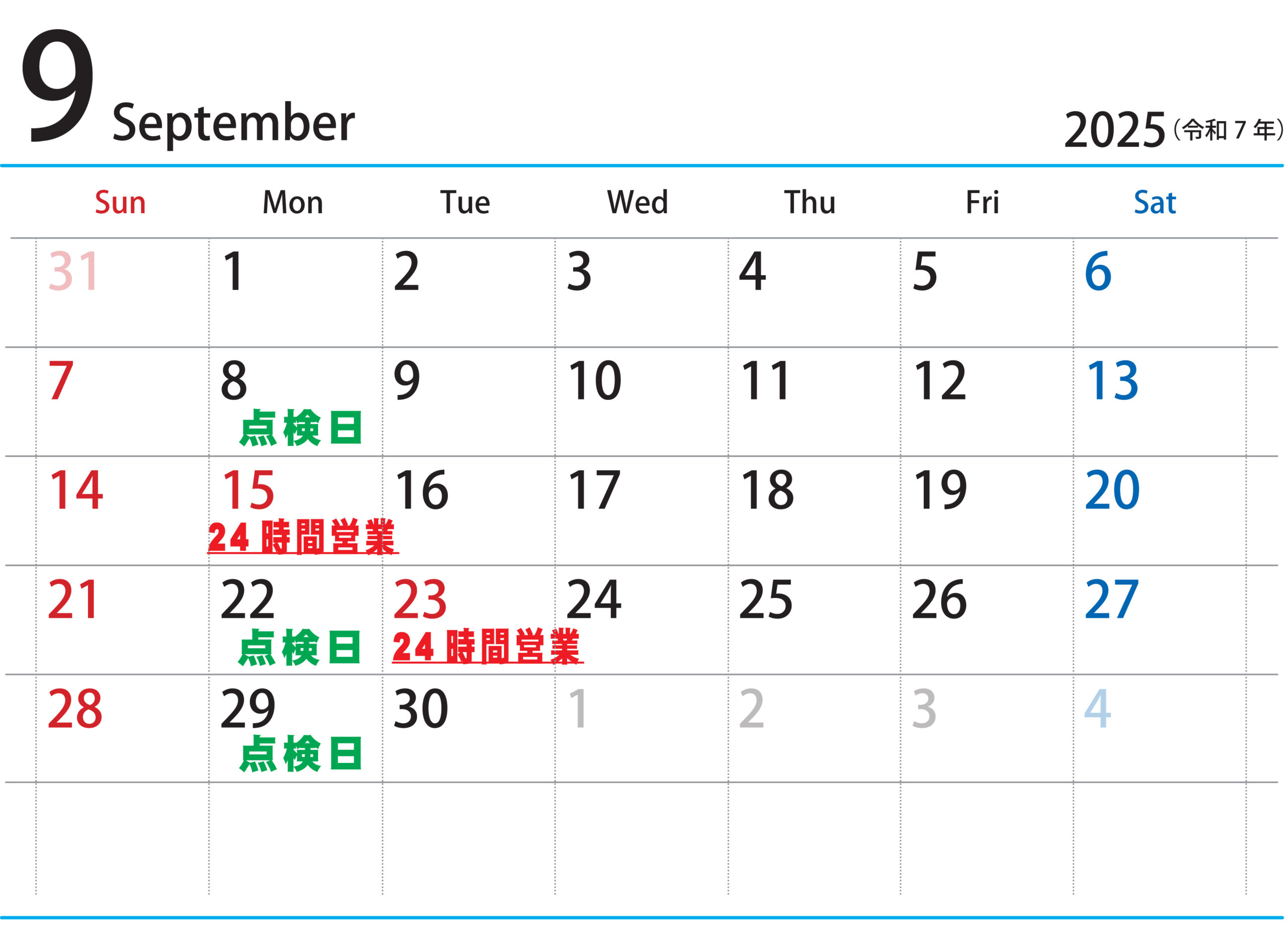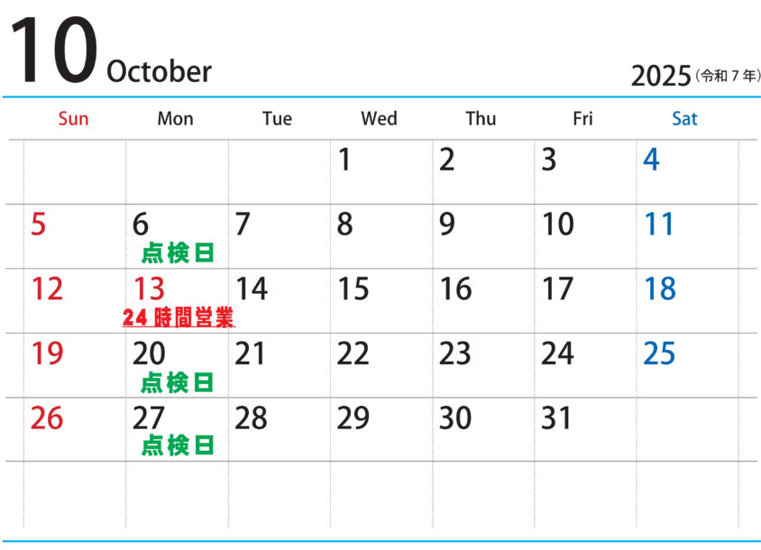 10月 営業案内 2025年9月30日 最終更新日時 : 2025年9月30日 staff 10月は、13日(月曜日)祝日は24時間営業です。6、20、27日の月曜日は、設備点検のため6時から11時はメンテナンス休業です。 お間違えのないよう、よろしくお願いいたします。